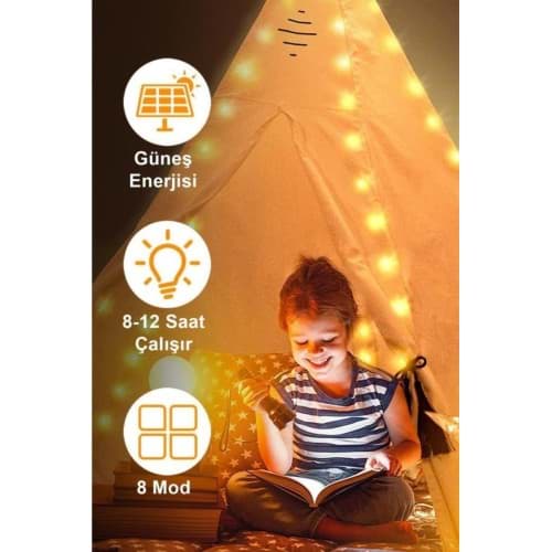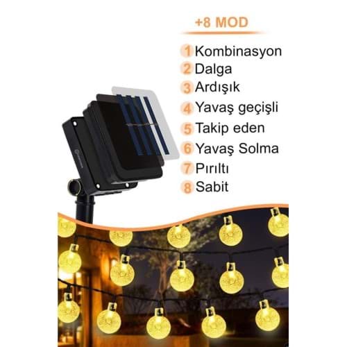 DEKORATİF BAHÇE LAMBASI 9 METREBahçenizi ve Dış Mekanları AydınlatınDekoratif Bahçe Lambası 50 Ledli, su geçirmez tasarımı sayesinde bahçe içi ve dışında, çatı katı, teras gibi alanlarda rahatlıkla kullanabileceğiniz mükemmel bir dekorasyon lambasıdır. 30 ledli olmasıyla yeterli aydınlatma sağlarken, 9 metrelik boyuyla geniş bir alanı aydınlatır. Ürün, 8 farklı aydınlatma moduna sahiptir, bu sayede istediğiniz atmosferi yaratabilirsiniz. Kombinasyon, dalga, ardışık, yavaş geçişli, takip eden, yavaş solma, pırıltı ve sabit modları arasından seçim yapabilirsiniz. Ayrıca, ürün 8 ila 12 saat arası çalışma süresine sahiptir, böylece gece boyunca bahçenizde veya dış mekanlarda aydınlatma sağlar. Kolay taşınabilir ve ergonomik tasarımıyla istediğiniz yere rahatlıkla taşıyabilirsiniz. Ürün içerisinde bulunan açma kapama tuşu sayesinde kullanıma hazır hale getirebilirsiniz. Ürünü çalıştırmak için güneş enerjisi alması gerektiğinden, gün boyunca güneş ışığına maruz bırakmanız yeterlidir. Bahçenizi ve dış mekanları aydınlatmak ve dekoratif bir görünüm kazandırmak için ideal olan bu lamba, şık tasarımıyla da göz doldurur.Paket İçeriği1 adet dekoratif bahçe lambası 9 metre