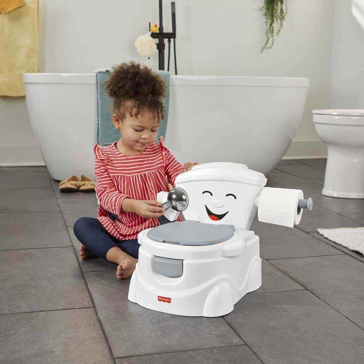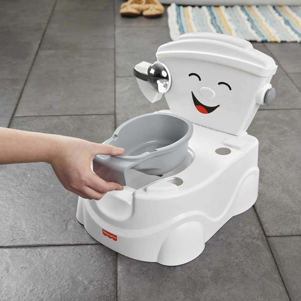 Fisher Price Eğitici Eğlenceli Tuvalet (Türkçe), çocuğunuzun tuvalet eğitiminin daha kolay ve eğlenceli geçmesini sağlar. Üzerinde sevimli bir yüz bulunan bu etkileşimli tuvalet, eğlenceli şarkılar ve ifadelerle miniğinizin her başarısını kutlar. Çocuklar için ideal boyda üretilen bu tuvalet; tıkırtılı sifon kolu, kapağı açılıp kapanan çıkarılabilir tuvalet oturağı ve açılır tuvalet kağıdı tutacağı gibi ayrıntılarıyla gerçekçi görünür.