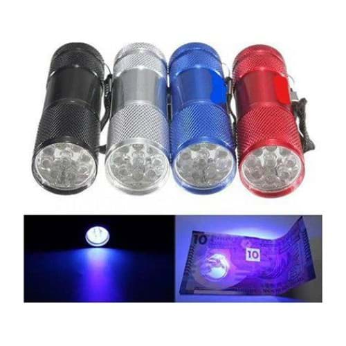 ULTRAVİYOLE EL FENERİ Uygulama alanları;Cihazlar.Sterilizasyon.Mürekkep kürü.Metal çatlaklarını tespit etme.Para dedektörü cihazı.Tıbbi ölçümler ve biyometrik güvenlik testleri.Hidrolik kaçak.Süper parlak ve yüksek kalite.Güç: 3 x AAA pil (dahil değildir).Malzeme: Alüminyum alaşımı.Boyut: 84*23 mm. (L*D)Işık kaynağı: UltraviyoleLED numarası: 9Kabuk rengi: Gümüş/Mavi/Kırmızı Paket İçeriği1 Adet Ultraviyole Not: Renkler stok durumuna göre gönderilecektir.