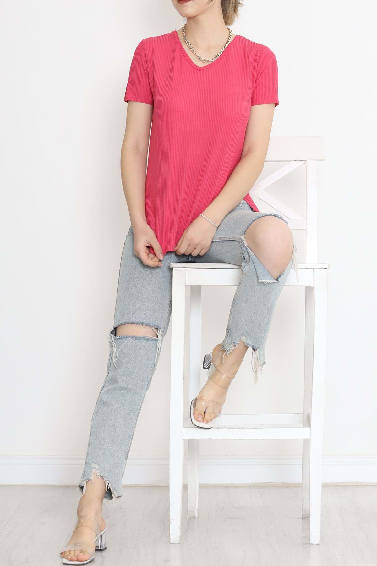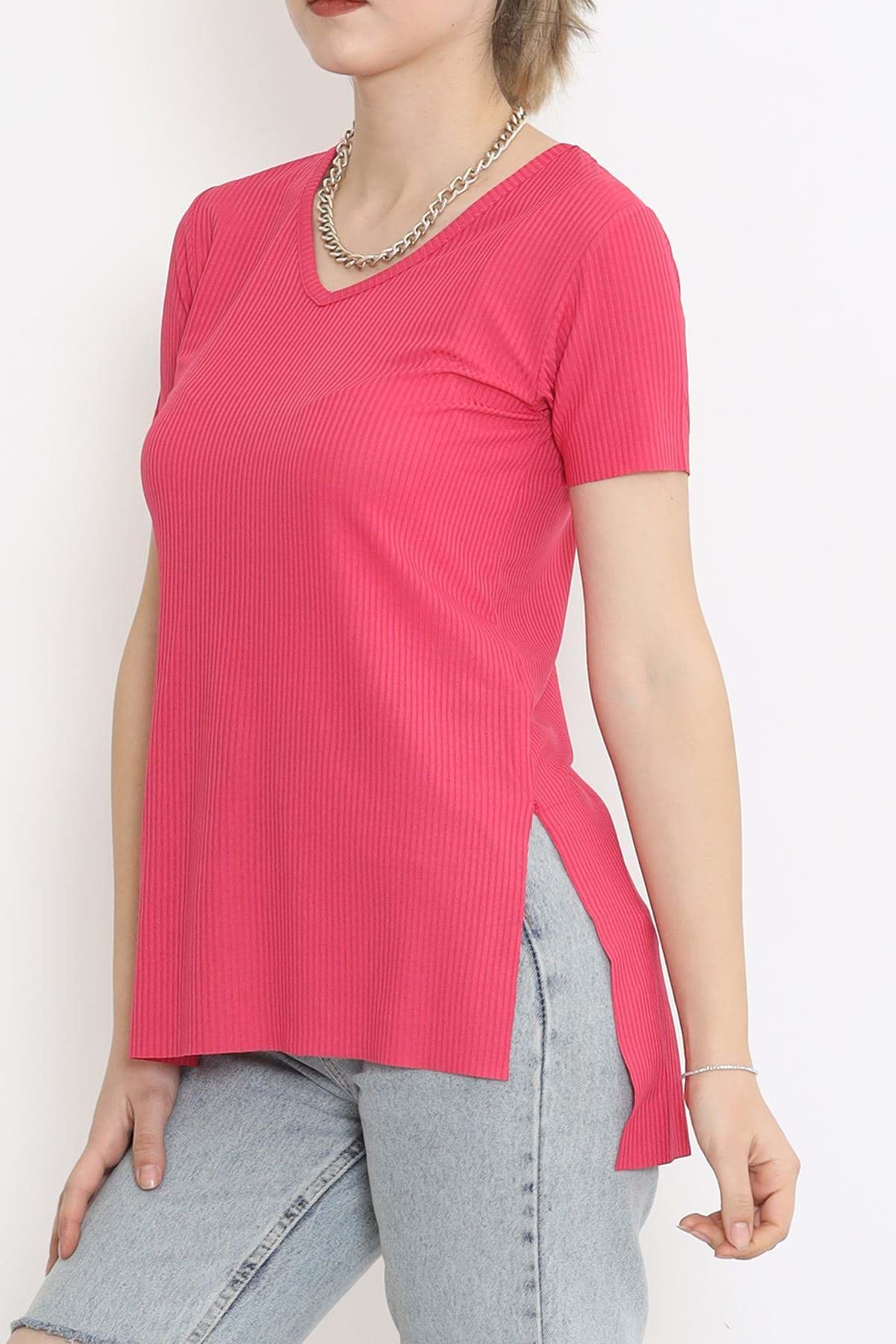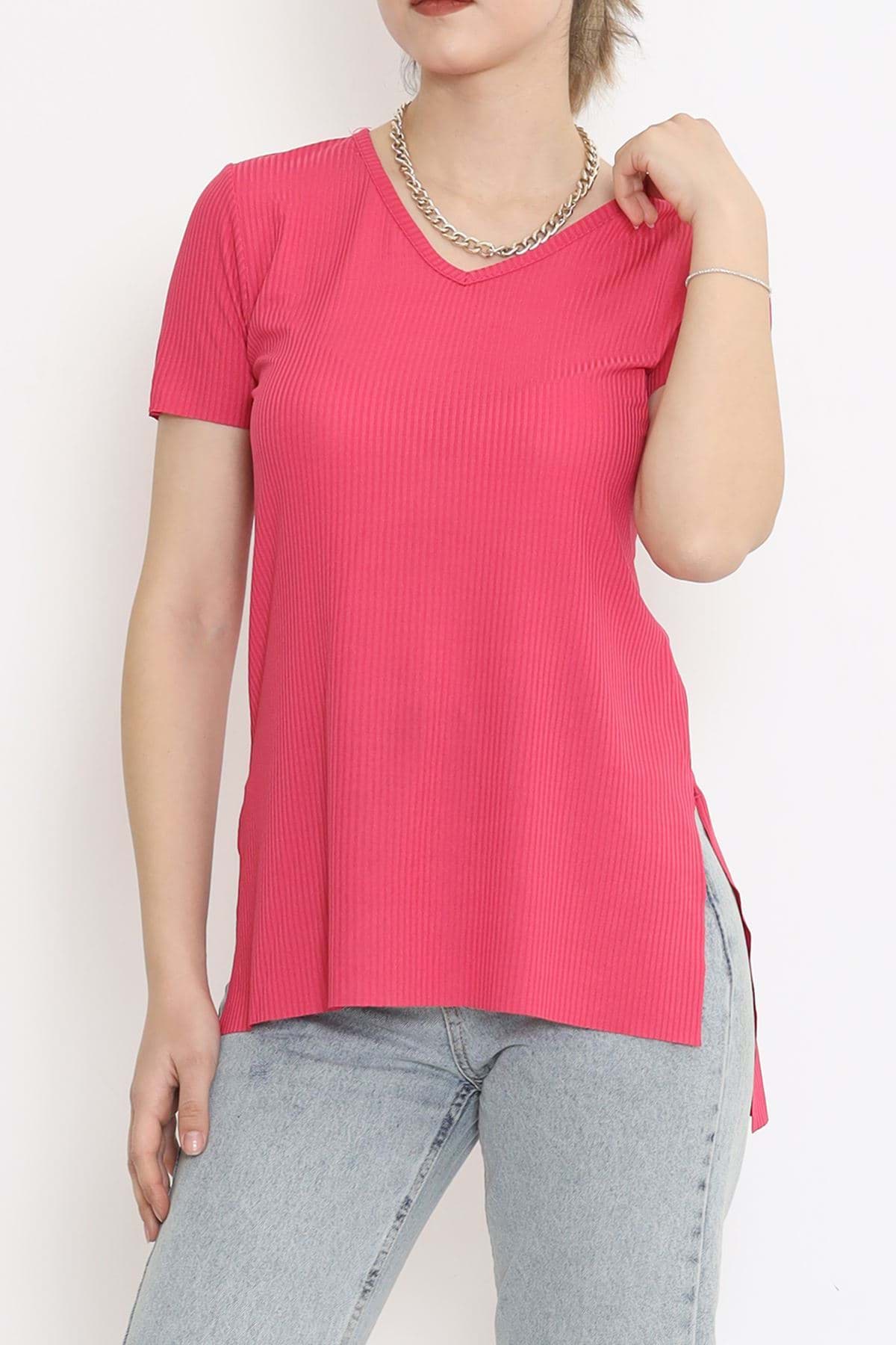 V Yaka Yırtmaçlı Tişört Fuşya - 1998.555.