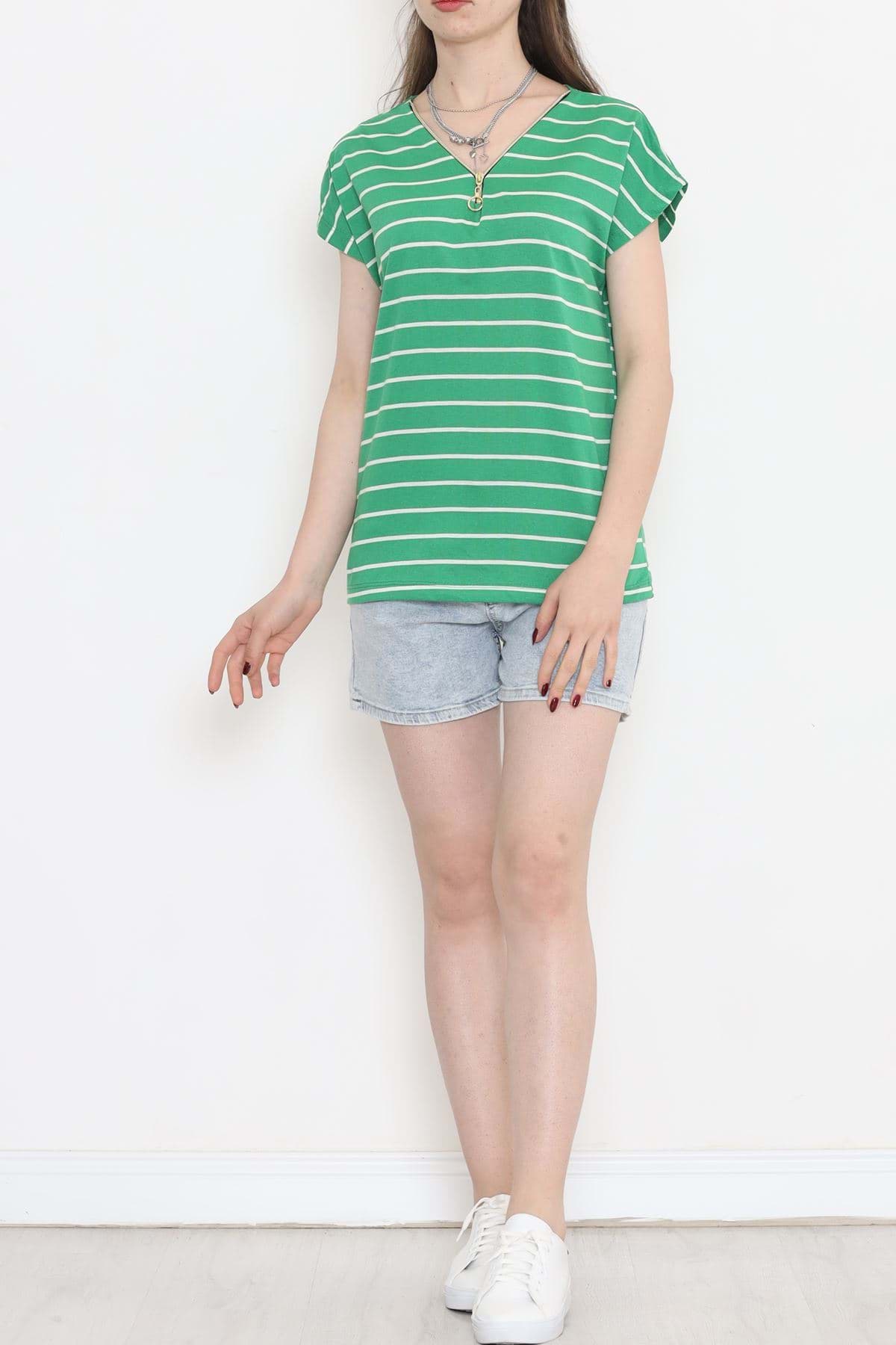 Fermuarlı Çizgili Tişört Yeşil - 9657.1567.