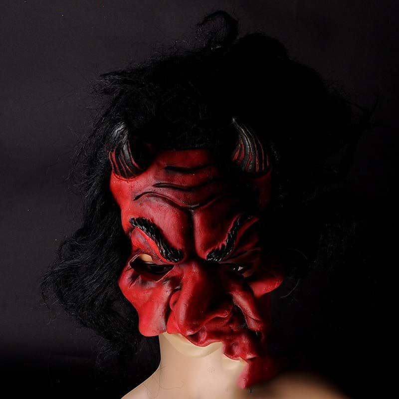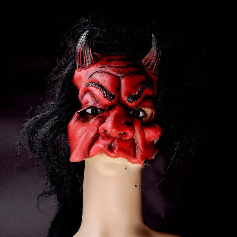 • Lateks Korku Maskesi Şeytan Boynuzlu Kırmızı Maske Saçlı resmi